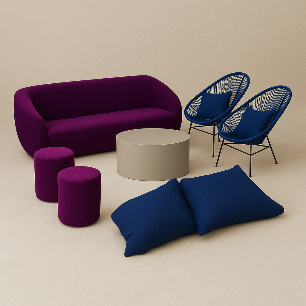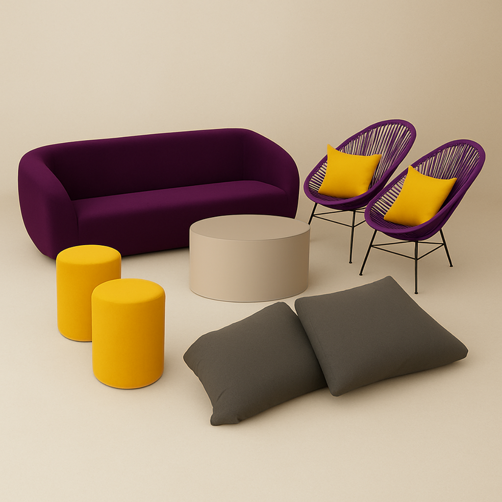 - Incluye 1 Sofás, 2 Cojines, 2 Taburetes redondos, 2 Sillas Acapulco y mesa de centro.