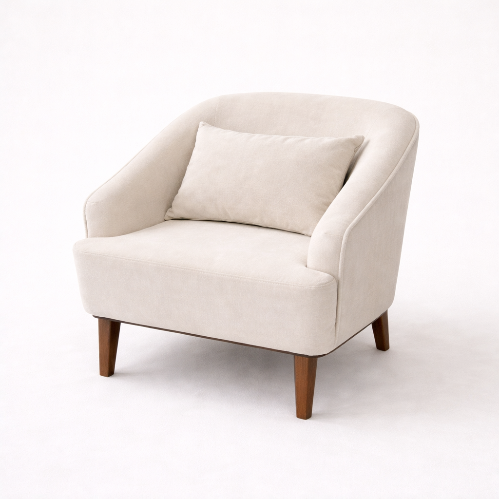 Renta el Sillón Bruma y añade una dosis de confort sofisticado a tu evento. Tapizado en suave tela beige y complementado con patas cónicas de madera oscura, este sillón ofrece un balance perfecto entre elegancia, calidez y comodidad. Ideal para salas lounge, recepciones o espacios de descanso.