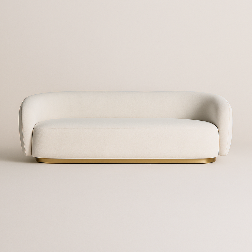 Dale un toque sofisticado y moderno a tus eventos. Este sofá destaca por sus elegantes líneas curvas, tapizado en suave bouclé color marfil que brinda una textura acogedora, y una base metálica dorada que eleva su presencia con un aire de lujo. Ideal para salas lounge, eventos sociales o sesiones fotográficas con estilo.
