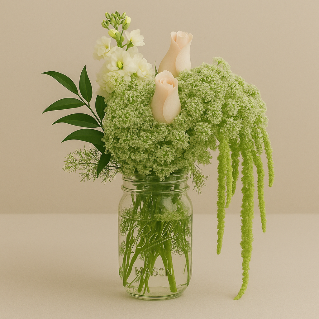 El Arreglo Floral con Mason Ball 32 oz Son Ideales para decorar Cualquier tipo de Evento o Fiesta, dale un toque único y diferente con el Arreglo Floral con Mason Ball 32 oz