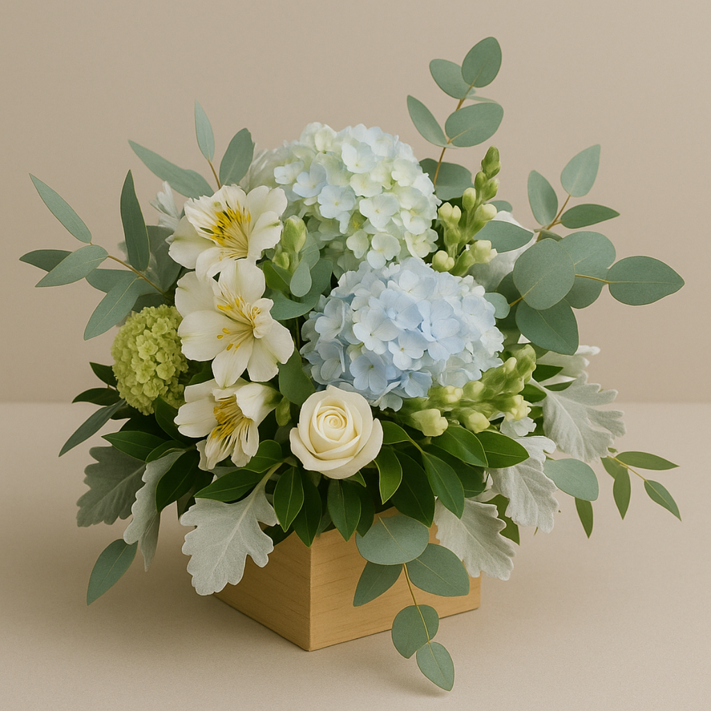 El Centro de Mesa con Follaje y Hortencia es ideal para decorar Cualquier tipo de Evento o Fiesta, dale un toque único y diferente con la tendencia en flores naturales