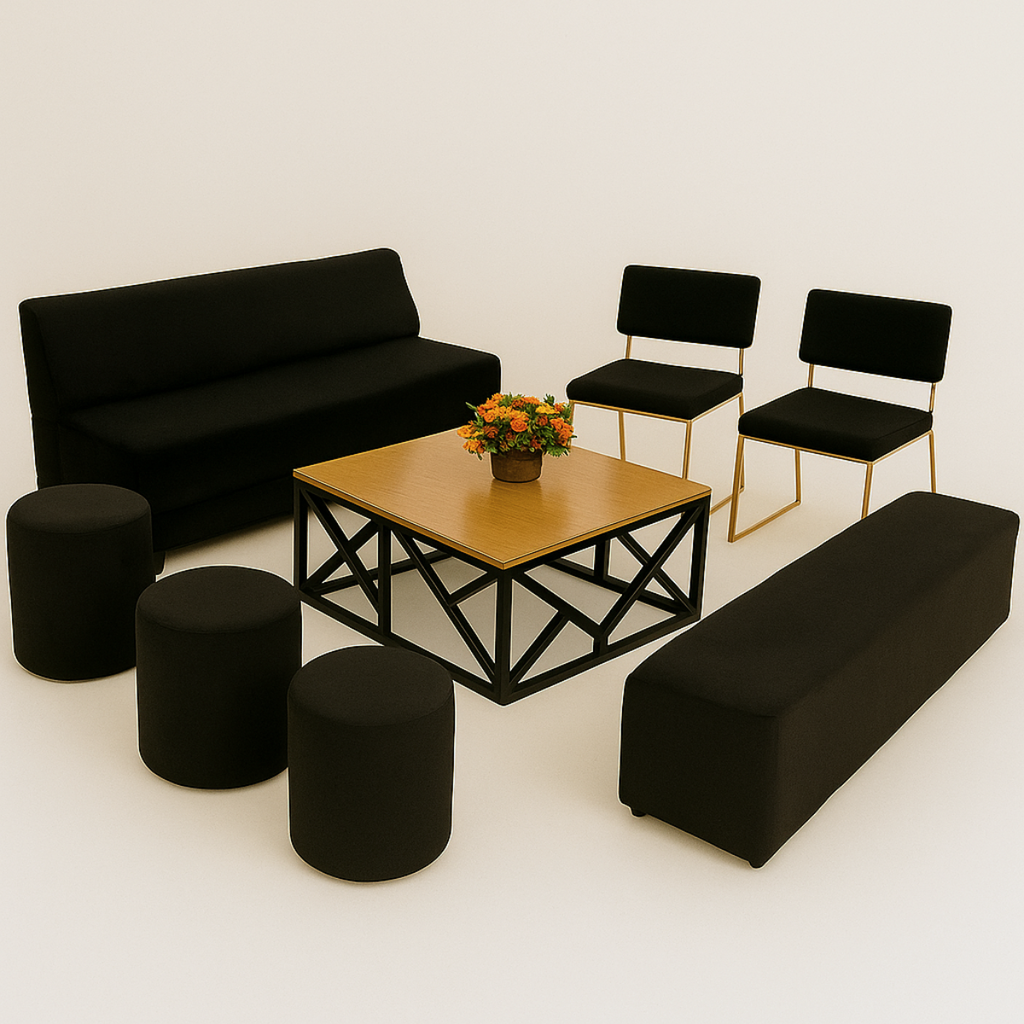 La Sala Elite Sexy Black Modelo 1 se adapta a cualquier tipo de evento, desde una boda, cumpleaños, presentación o comidas especiales. Renta estas Salas elite Negra con Gris para tu evento y dale un toque moderno y vanguardista.
